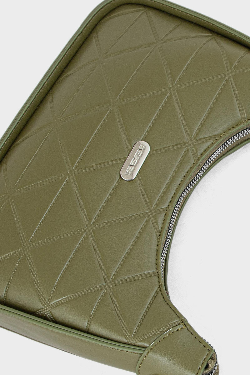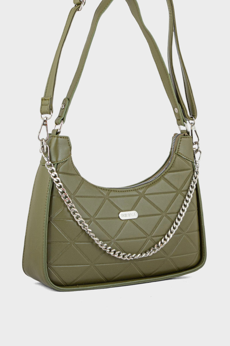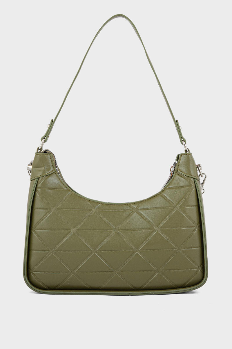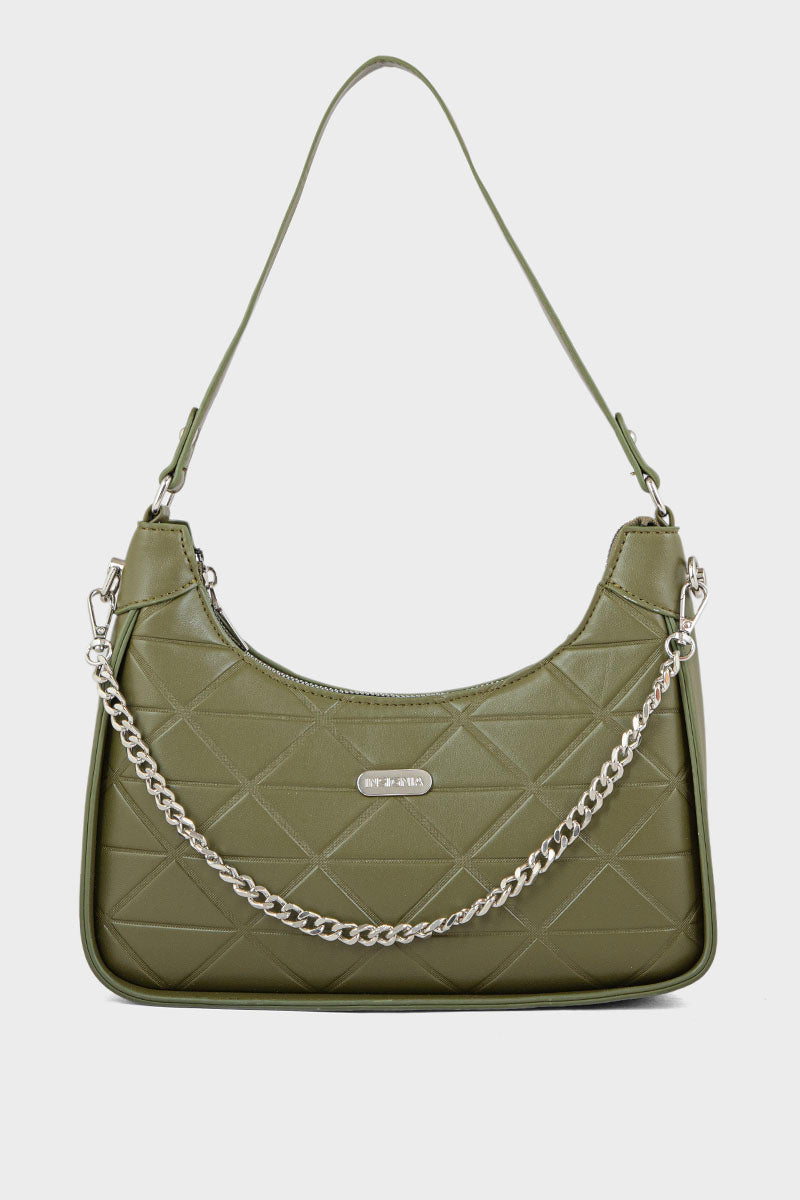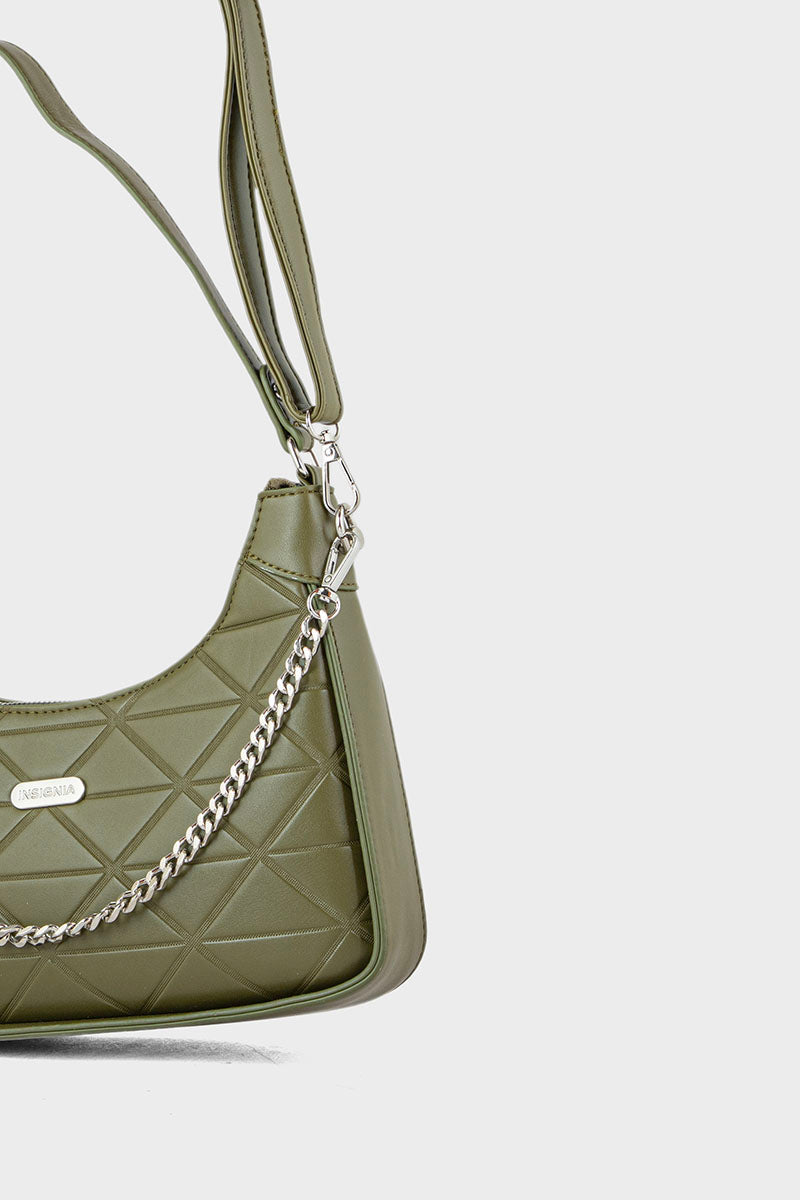 Trendy olive baguette shoulder bag with a sleek design and compact silhouette, perfect for a stylish and modern look.
