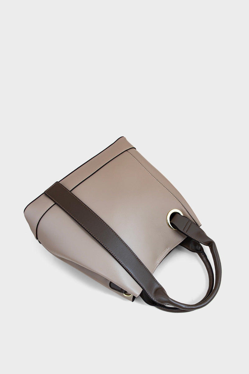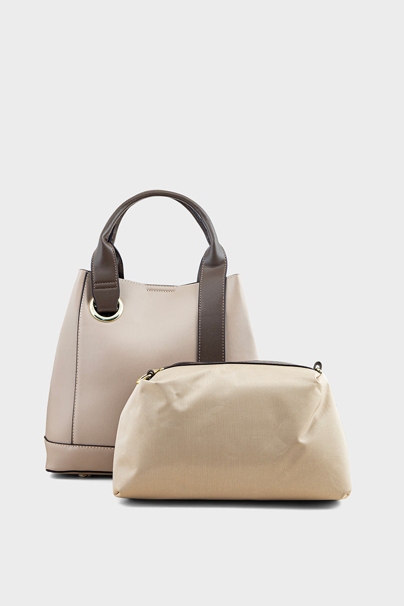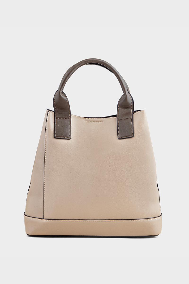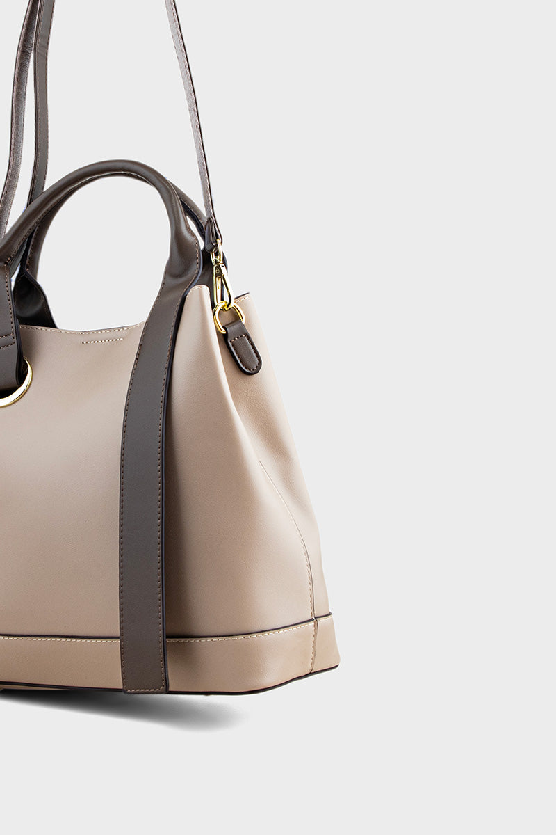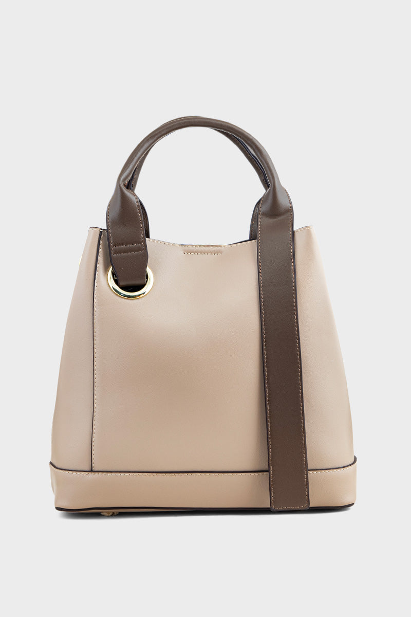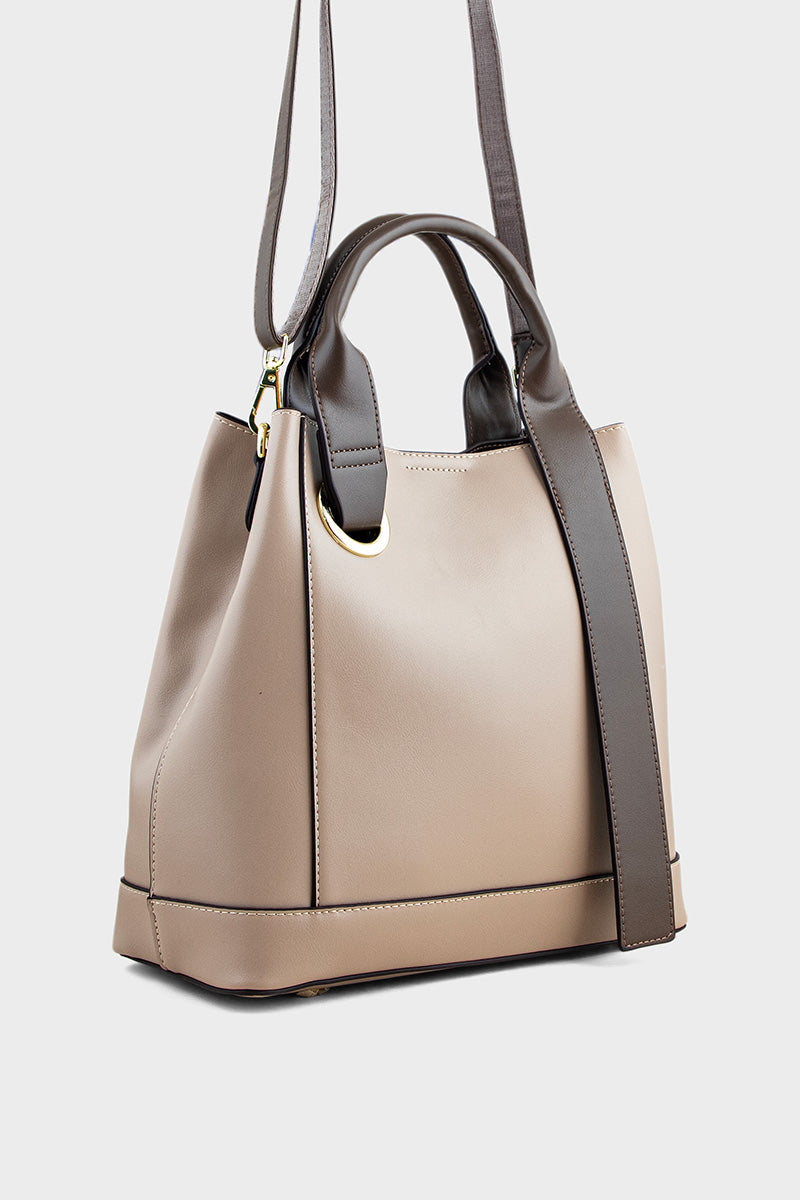 Description: Spacious beige bucket handbag combining style with practical storage.