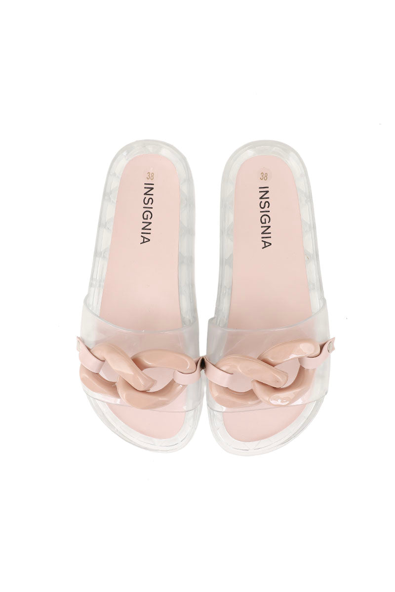 These pink slides are made with the single wide PVC strap, adorned with the chunky chain and then set over a plastic sole with some elevation.