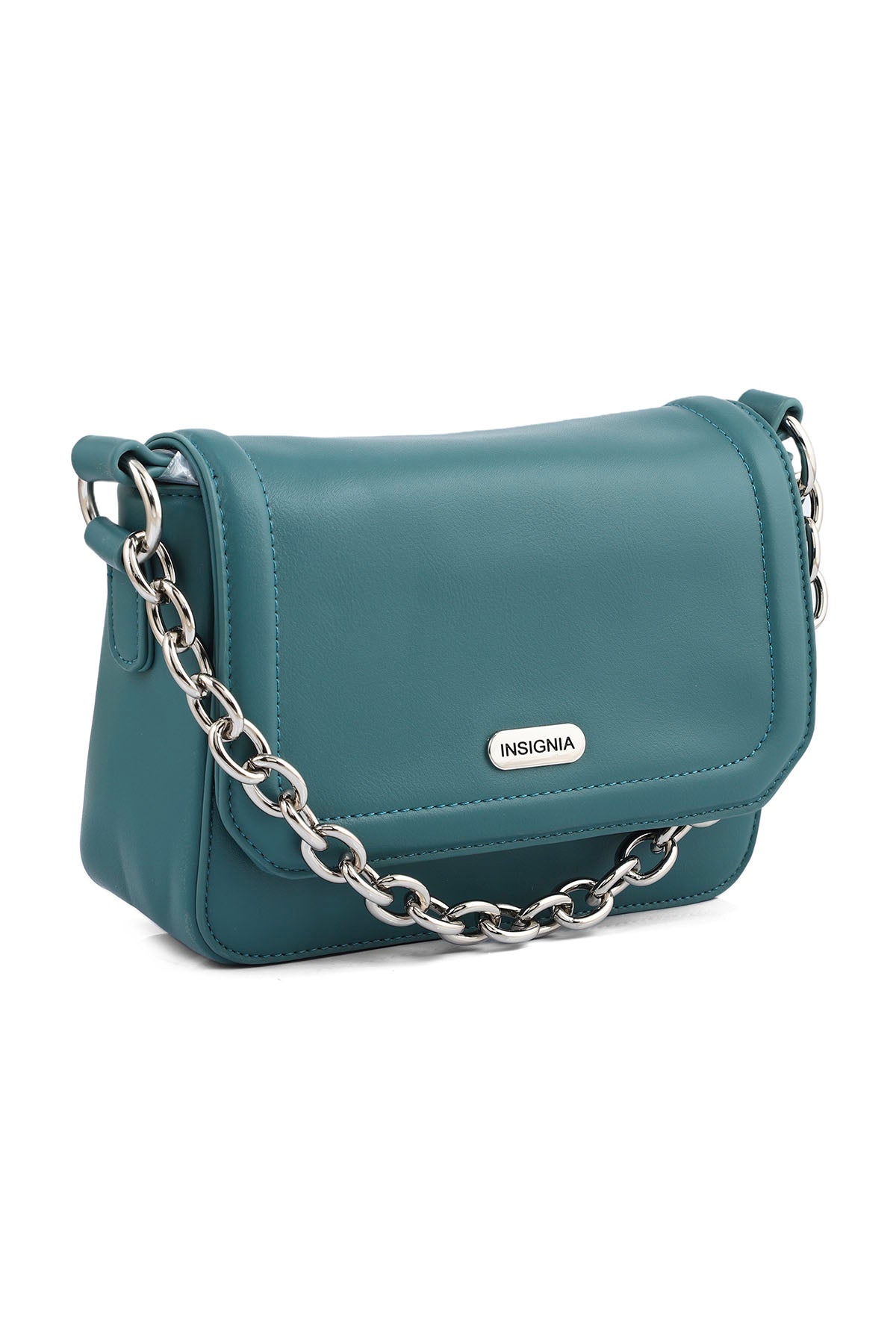 Stylish green handbag with silver hardware on it have one steal strap, adds a touch of elegance to any outfit