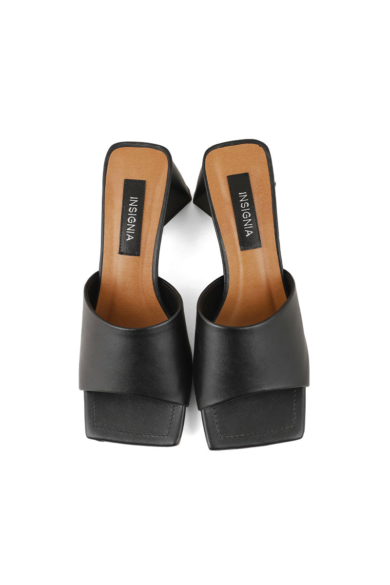 These black slides are made with the leather having a wide arch strap, shaped to an open toe and then set over a block heel.