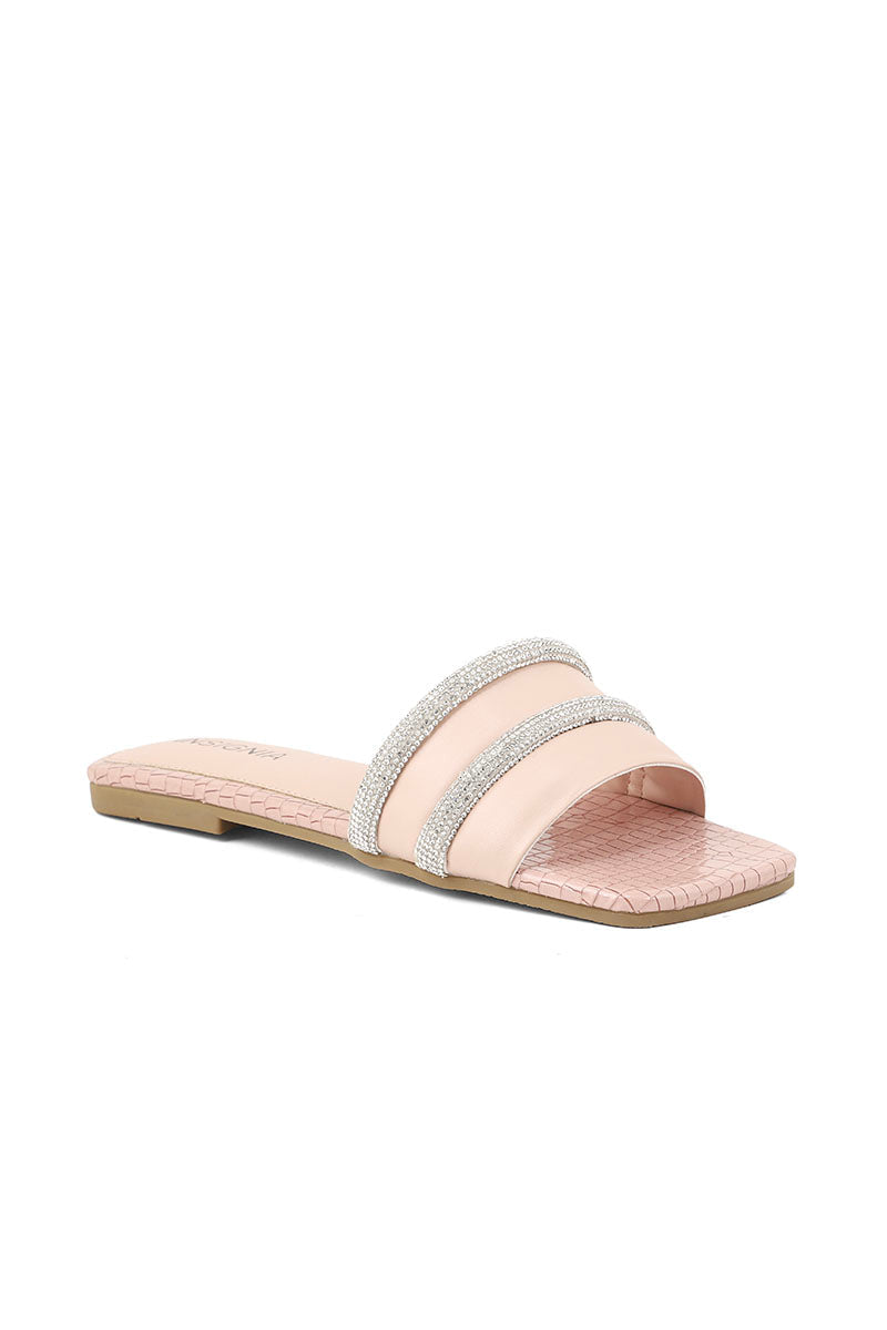 These pink slides are made with the plush leather having a wide arch strap that is shaped to a squared open toe and then set over a flat surface.