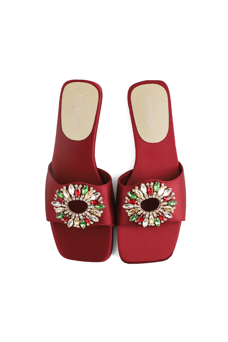 These maroon slides are made with the fine material wide arch strap that is adorned with a big motif and then set over a flatform base.