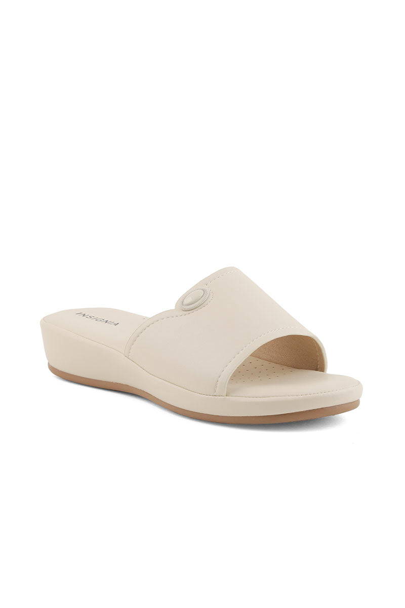 These fawn slides are made with lustrous leather, having a single wide strap then set over a chunky sole.