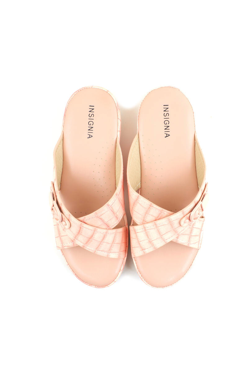 These pink slippers are made with cross style having the elegant self print, with buckle embellishment, over a chunky platform heel.