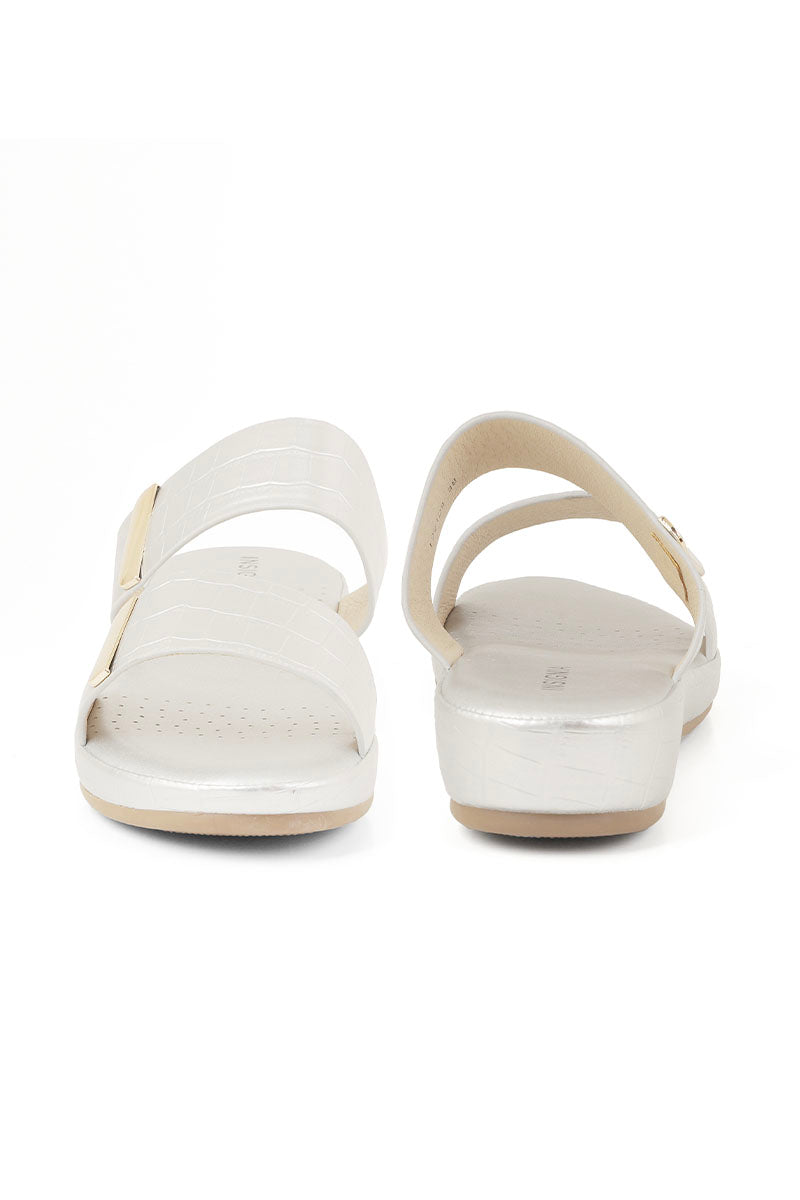 These silver slides are crafted with all the comfort in sole over a chunky platform heels. It has two shiny arch straps adorned with buckle style and finished to an open toe.