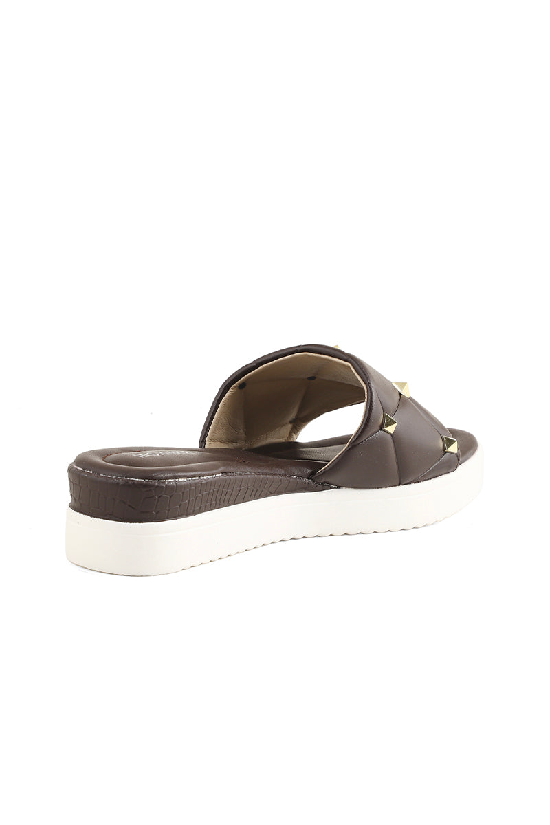 These brown slide is made with the wide arch strap that is embellished with small studs at top and then set over a white platform.