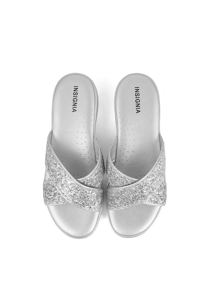 This silver slide is made with the lustrous material, having crossover strap design over a chunky sole and finished to an open toe.