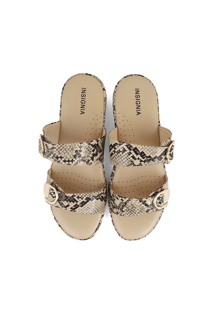 This fawn slide is made with the python style pattern having double arch straps that finish to an open toe, and then set over a platform sole.