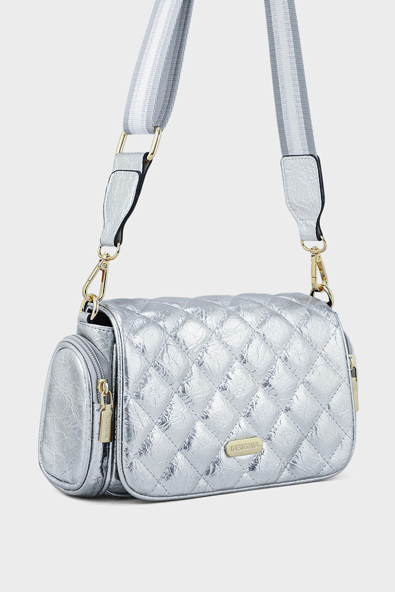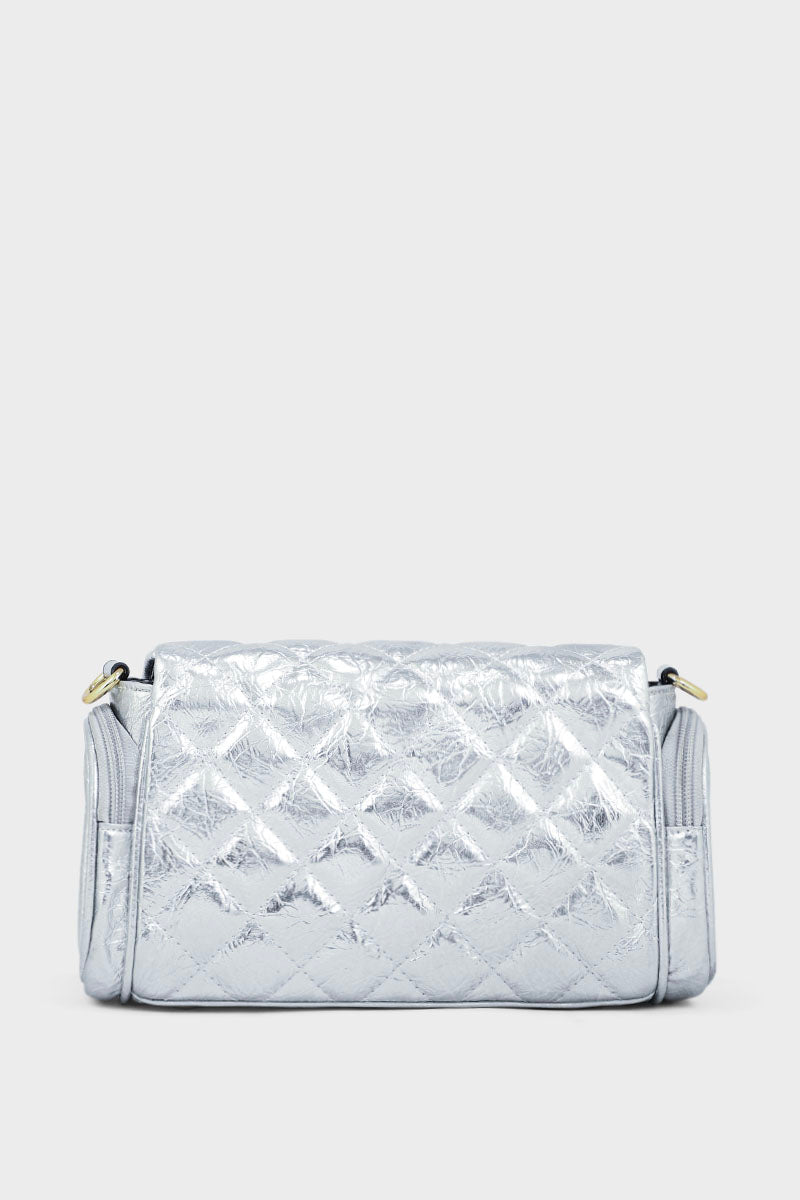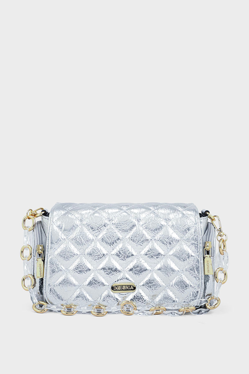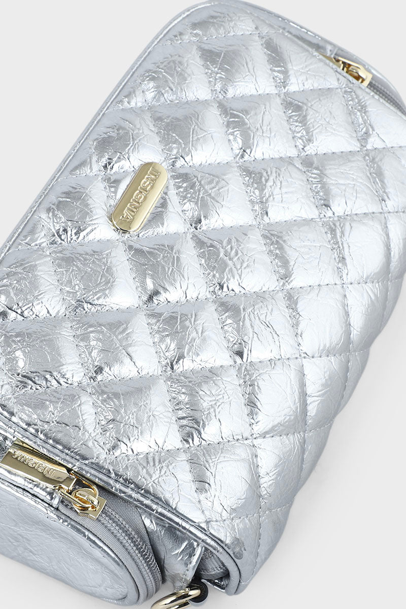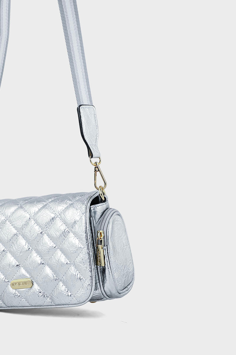 Stylish silver cross-shoulder bag with a sleek design and shimmering finish, perfect for a chic and sophisticated look.