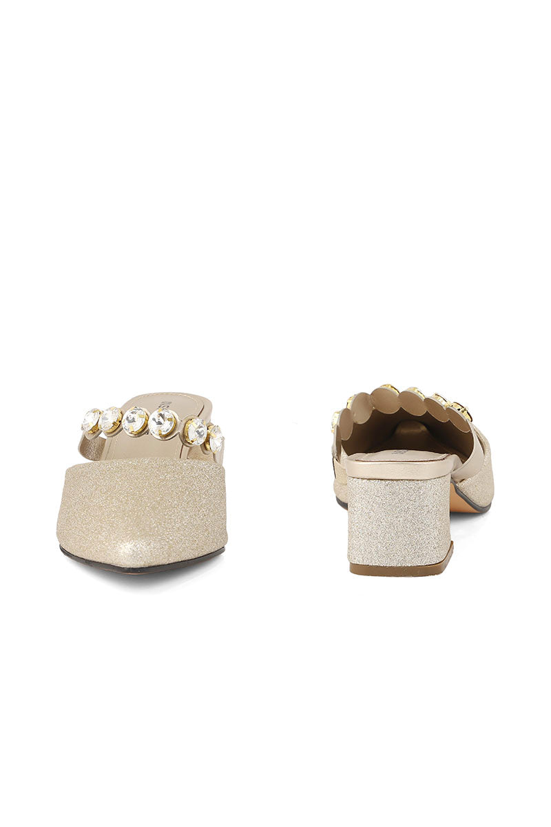 These golden mules are made with the lustrous leather, having fancy arch strap, shaped to an almond toe and then set over a small chunky block heel.