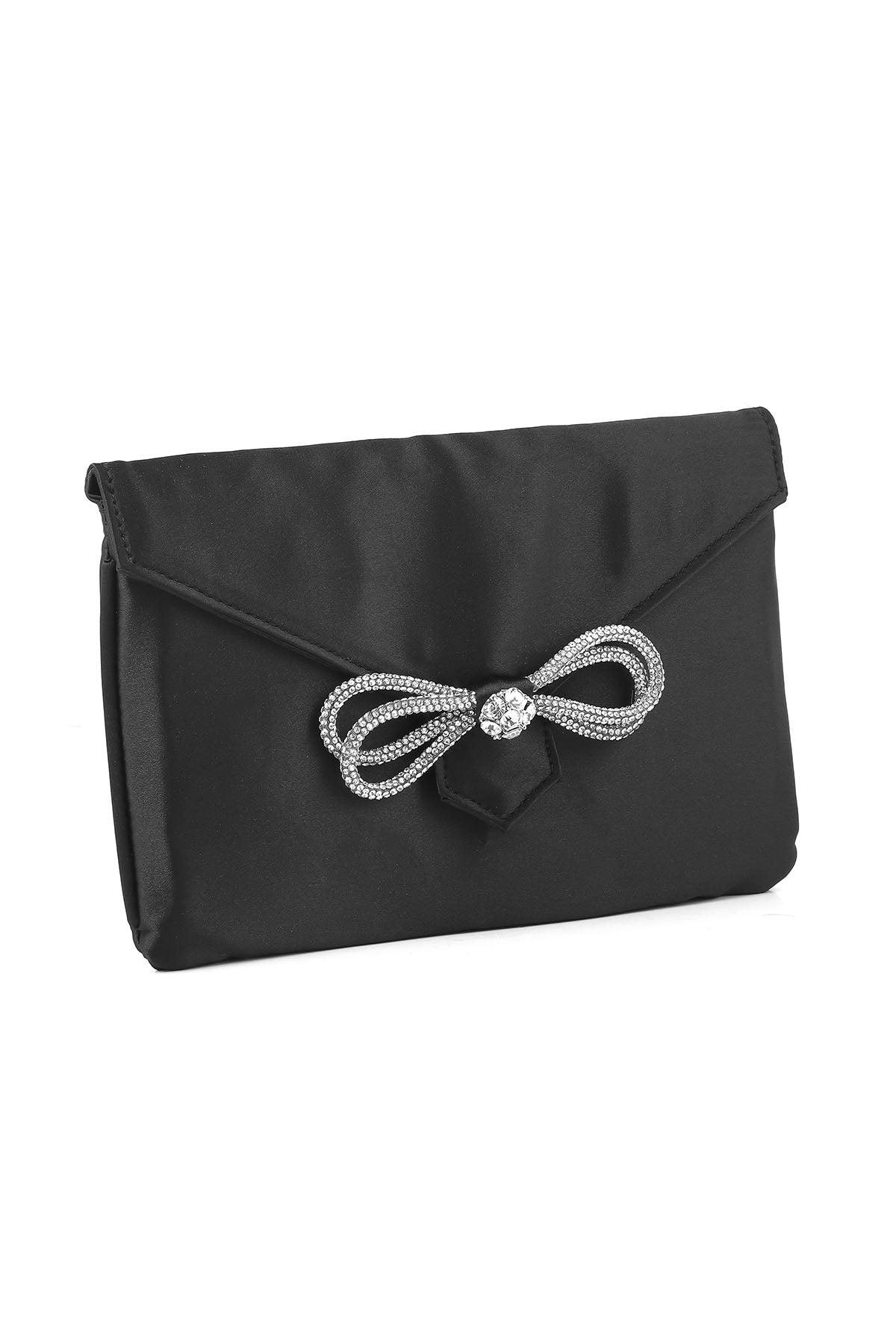 This black clutch is made with the lustrous satin, having a flap over design that closes with a fancy bow at the front.