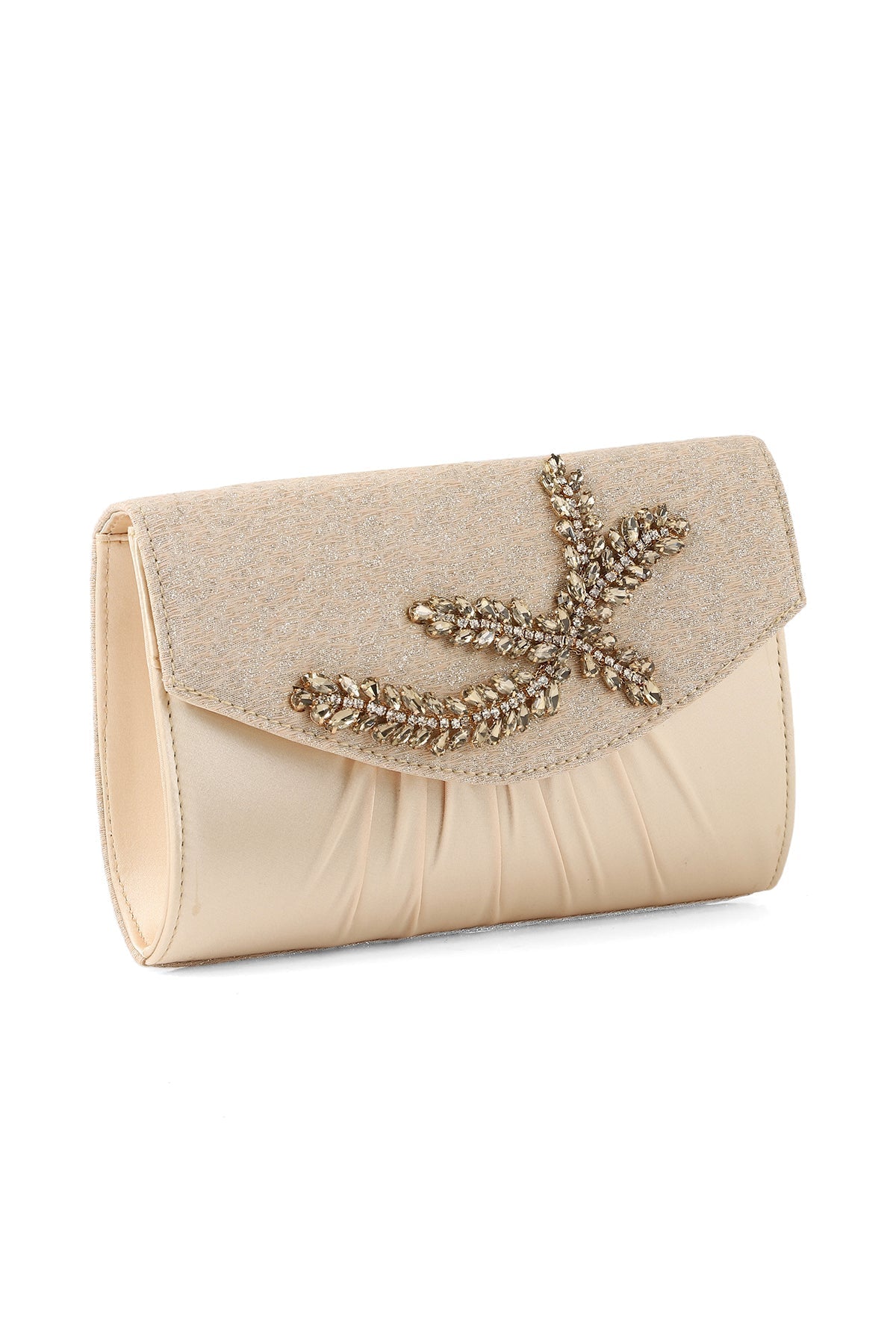 This beige clutch is made with the satin, having flap over design that is adorned with a big shiny motif at front.
