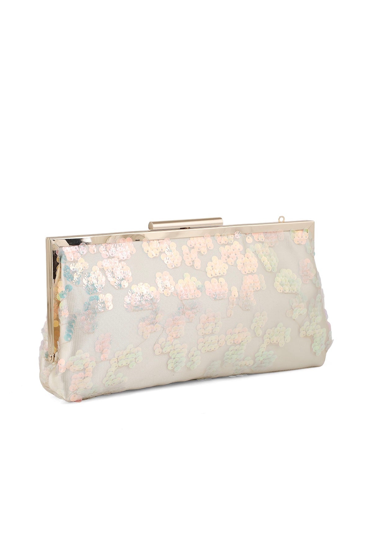 This pouch style beige clutch is made with the lustrous satin, having floral desing overall and then finished to a twist lock at the top.