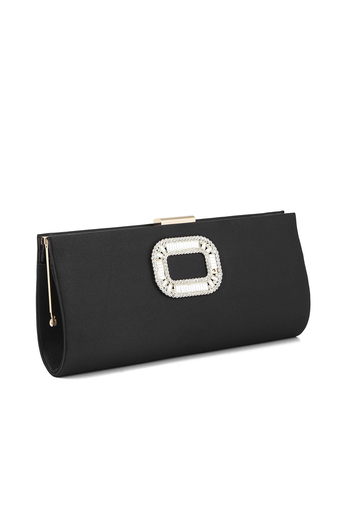 This black clutch is made with the plain satin, embellished with a silver motif at front and then finished to a twist lock at top.
