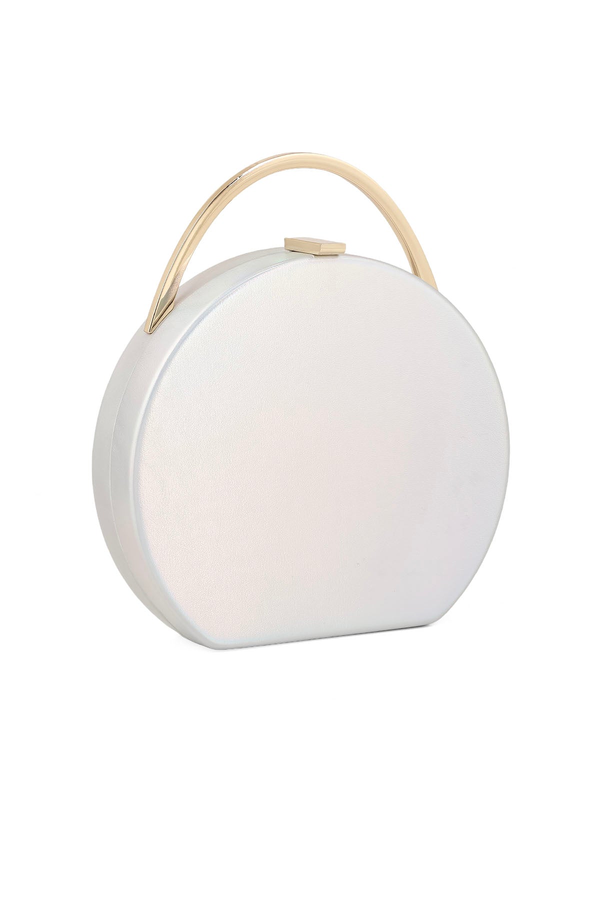 This silver colored clutch bag is made with a solid frame, having spacious compartments inside and then finished with a metallic handle at top.