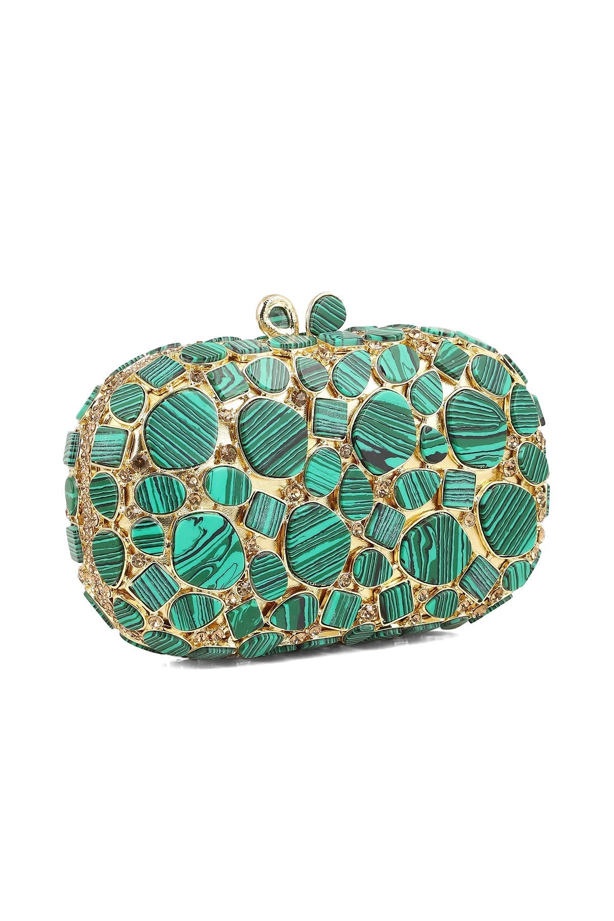 This is a green color clutch on an opening there is a beautiful opener. The shape of the clutch is an ocval shape. The bag can be used as a stylish accessory for a formal occasion.