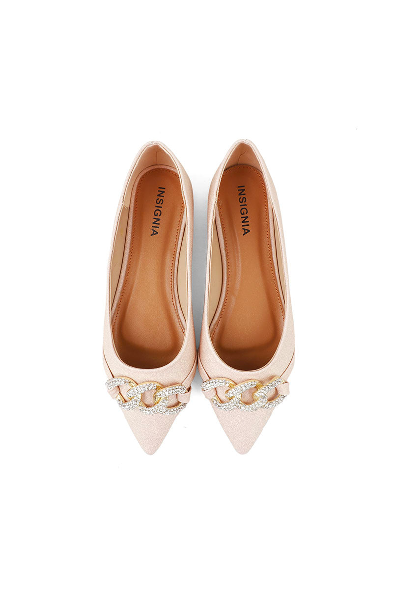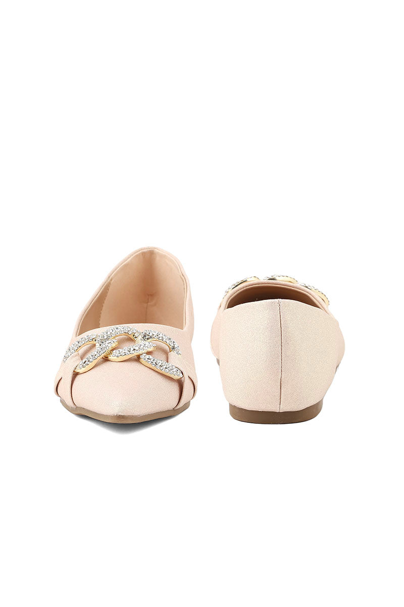 These peach pumps are made with the leather, having beautiful metal embellishment at top with a belt, and then shaped to a pointed toe.