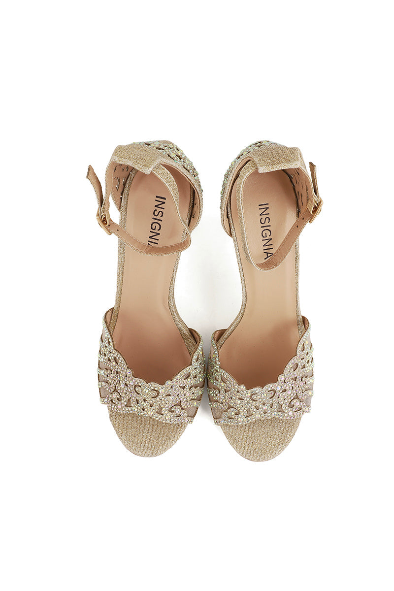 These golden heels are made with the mesh wide strap, having an ankle strap and then set over a sturdy heel.