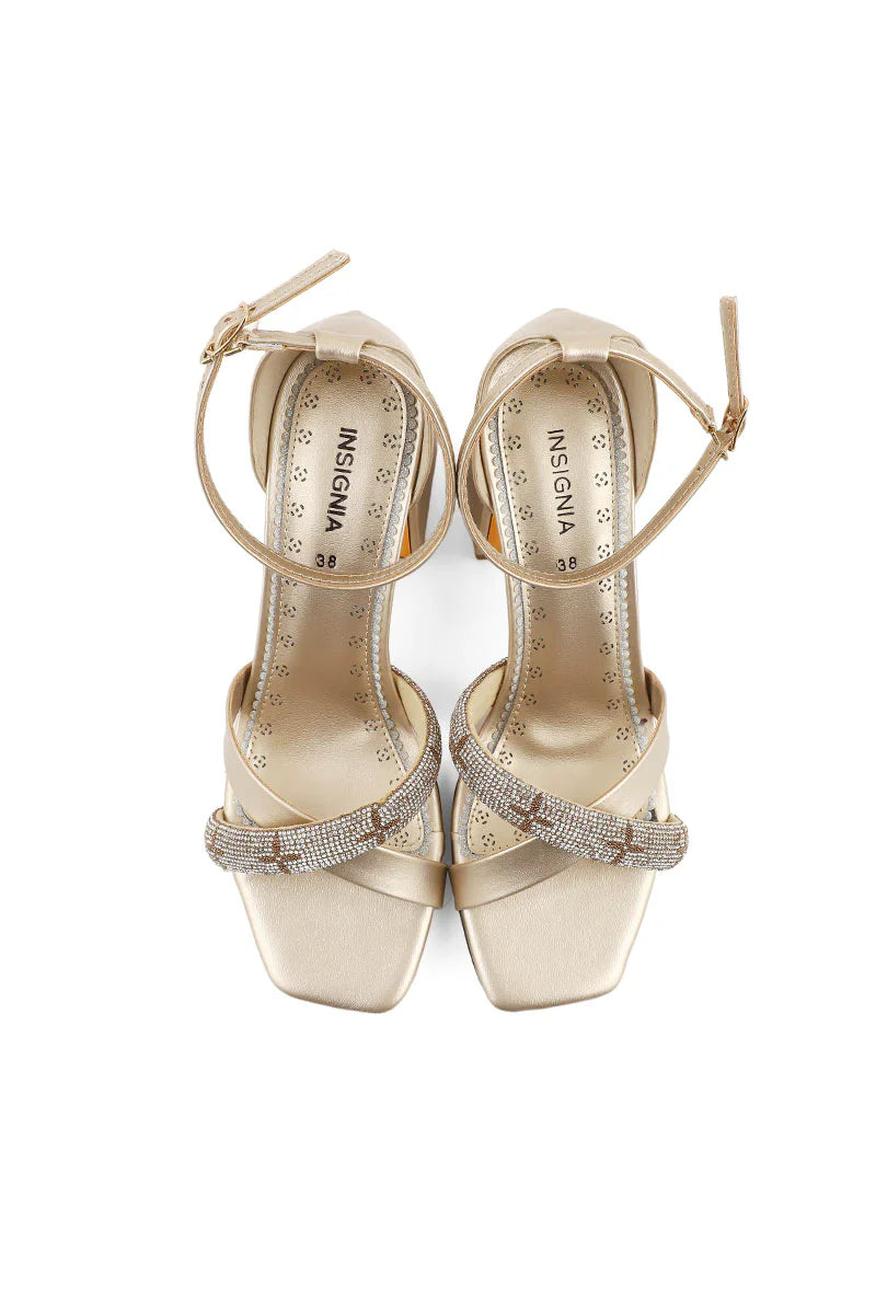 These golden sandals are made with the leather with fine chrome base, shaped to an open toe and then set over a chunky block heel.