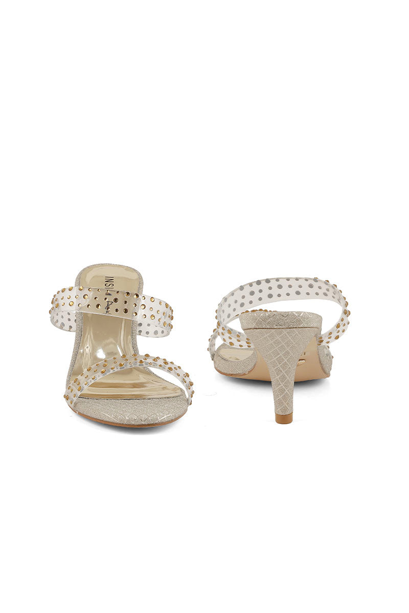 These golden slides are made with the finest PVC straps having the diamnates embellsihement at the top and then set over a low comfortable heel.