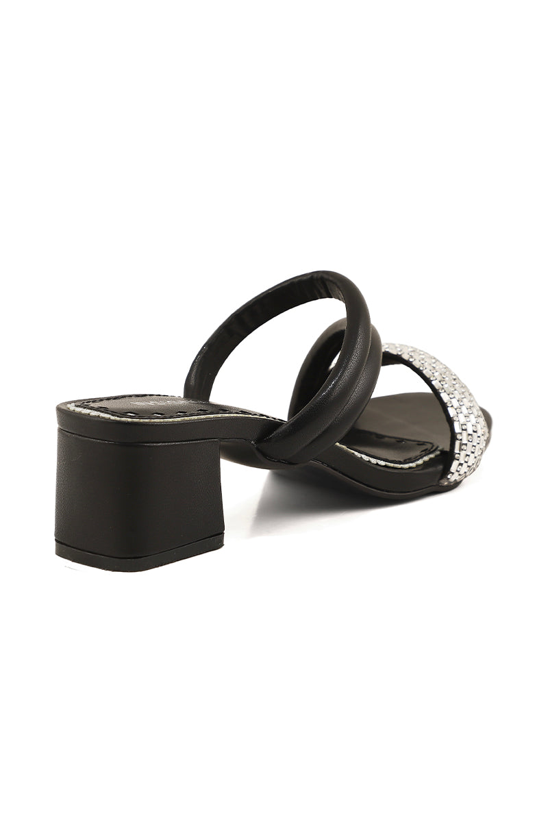 These black slides are made with the slender straps and an embellsihed arch strap, then set over a sturdy block heel.