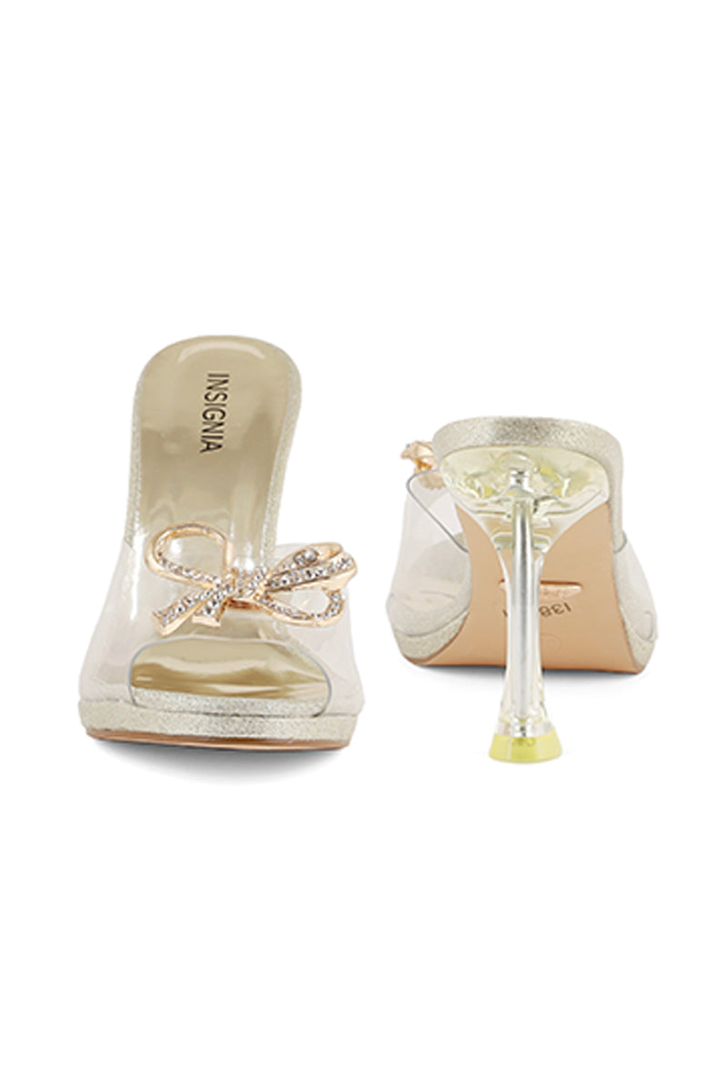 These golden mules are crafted with high quality PVC, having pointed toe front that is embellished with a fancy bow at top.