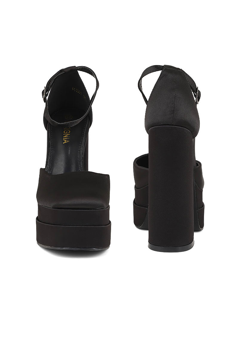 These black platform heels are made with the fine suede and satin, having squared toe over the chunky platform with high block heel and ankle strap for a great grip.