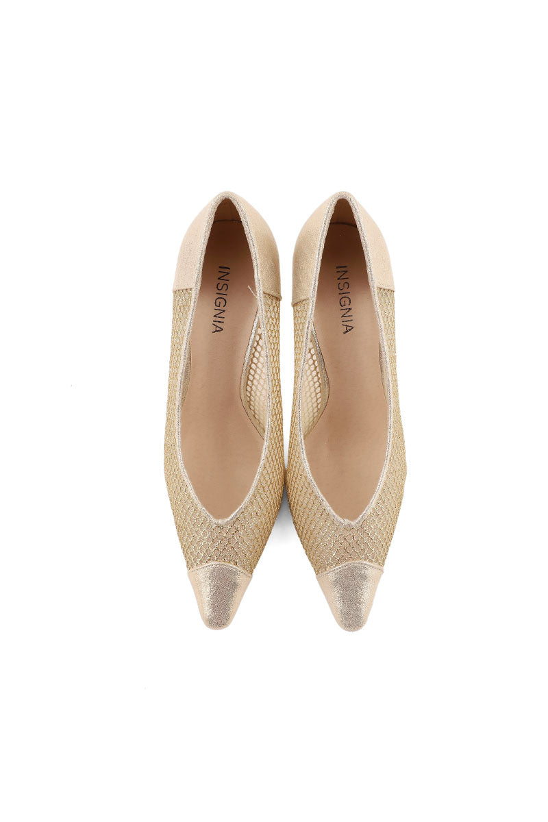 These goden pumps are made with the high quality mesh, with a sharp pointed tow made with metallic leather, then set over a mid height heel.