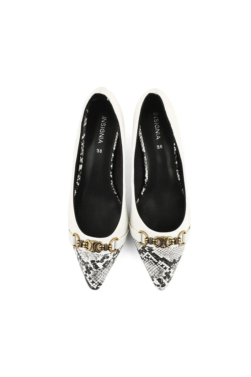 These white pumps are made with the plain leather from back and python pattern leather at front, adorned with a thin strap at top and then shaped to a sharp pointed toe.