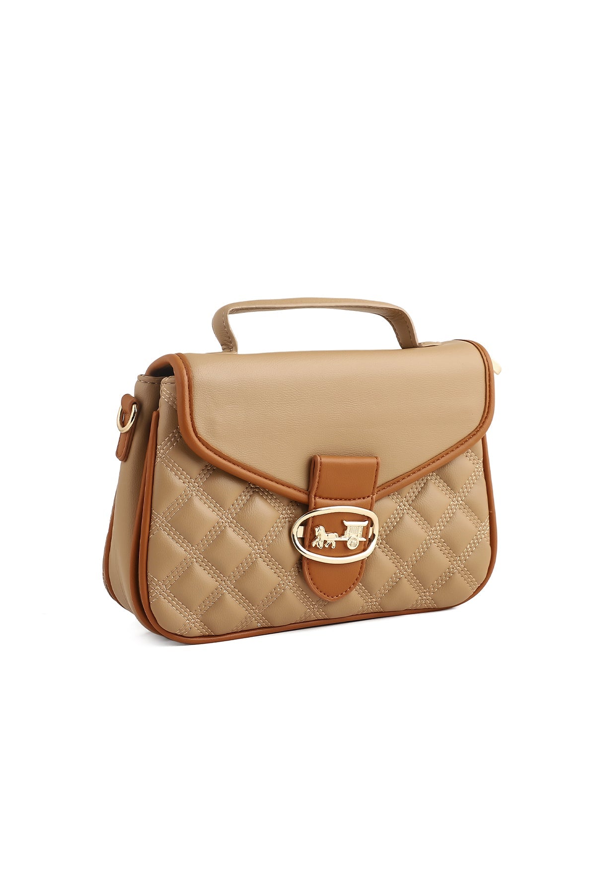 This beige bag is made with the plush leather, having the flap-over design that closes at a twist lock.