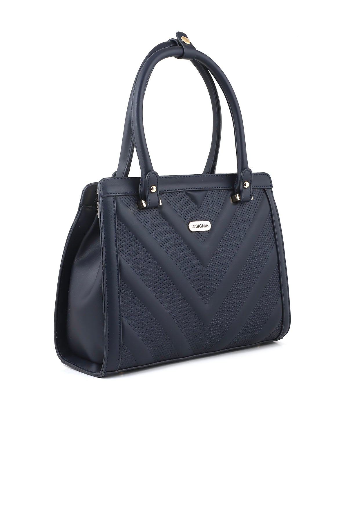 This blue bag is made from the leather having engraved v-pattern, and then finished with two top handle straps.