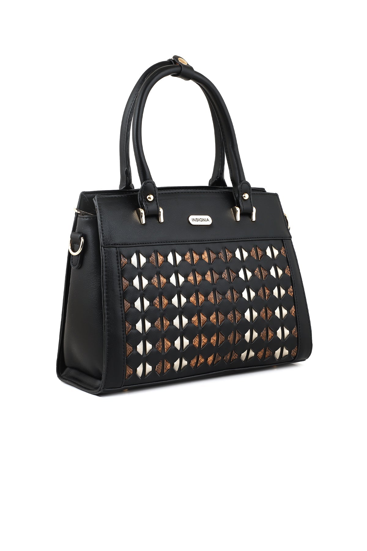 This black bag is made with the geuine leather, having mesh style at front depicting the pure white color and the finished with two top handles.