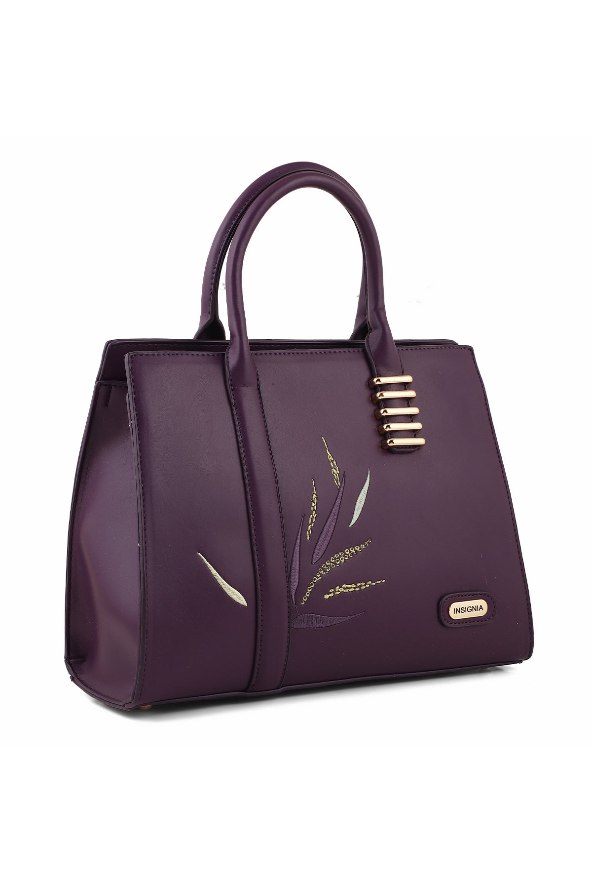 This purple bag is made with the fine leather, having engraved leaves design at front and then finished to two smart top handles.