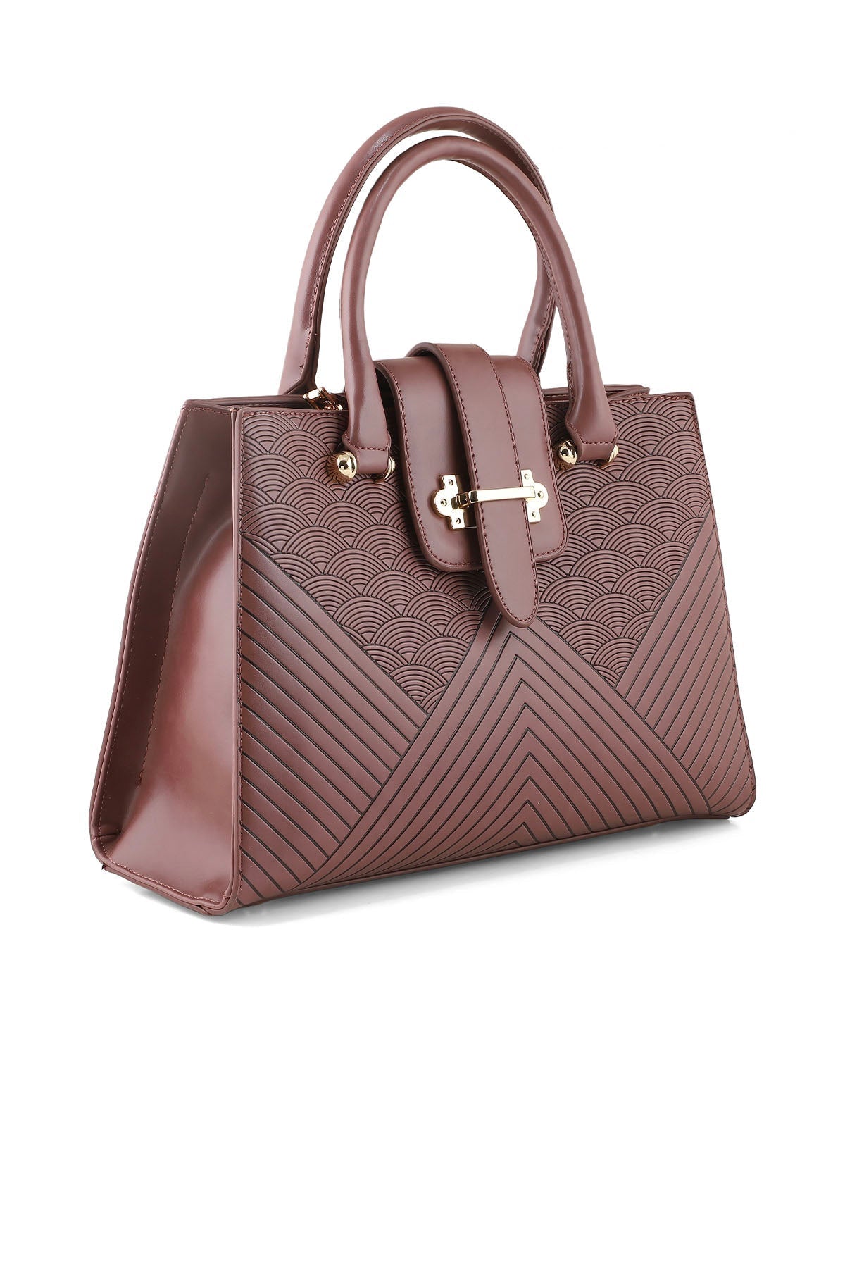 This purple bag is made with the finest leather, having some triangular patches at front with flapover belt design and then finished with two small top handles.