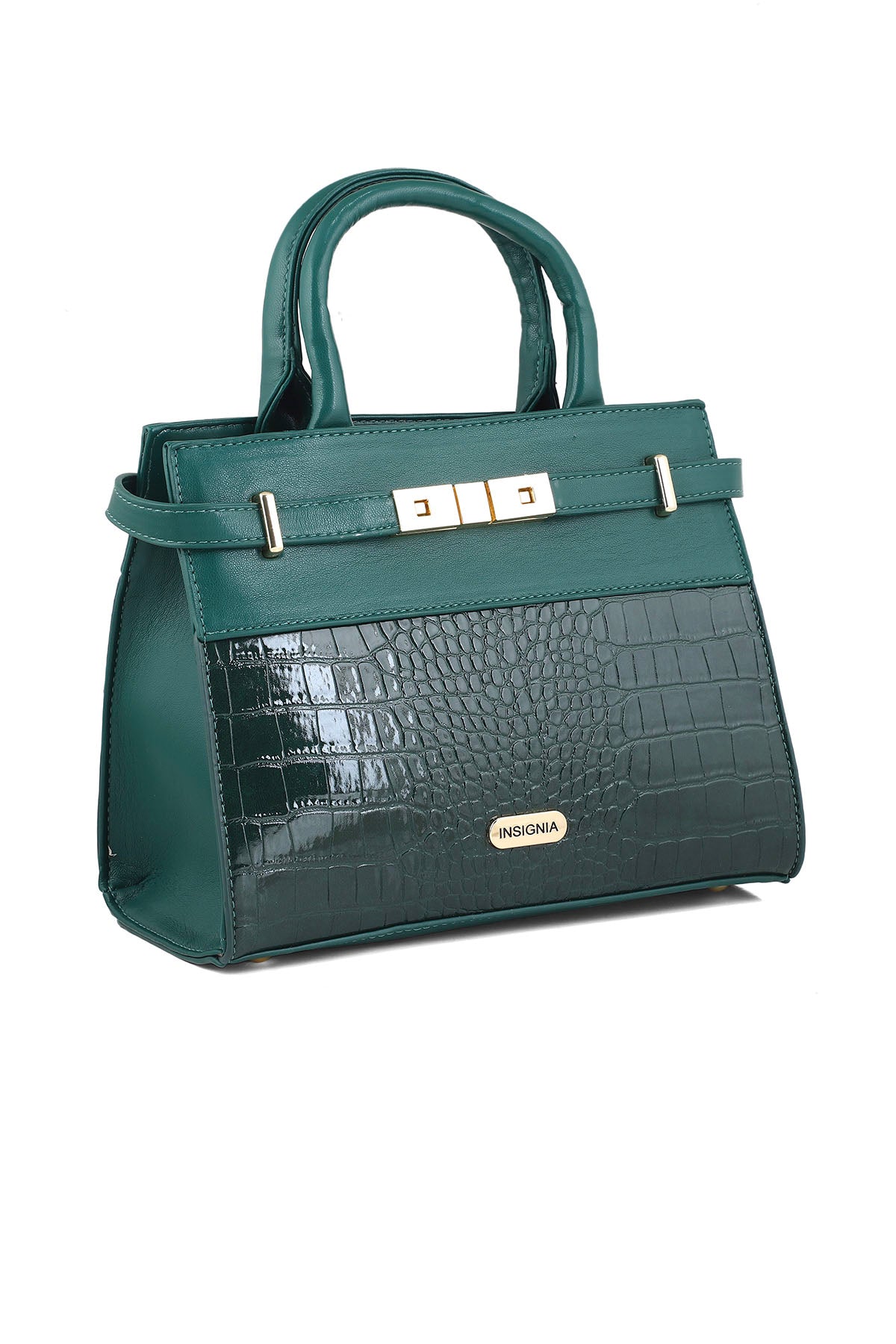 The green bag is made of high-quality leather, featuring a smooth surface and silver hardware with a classic design.