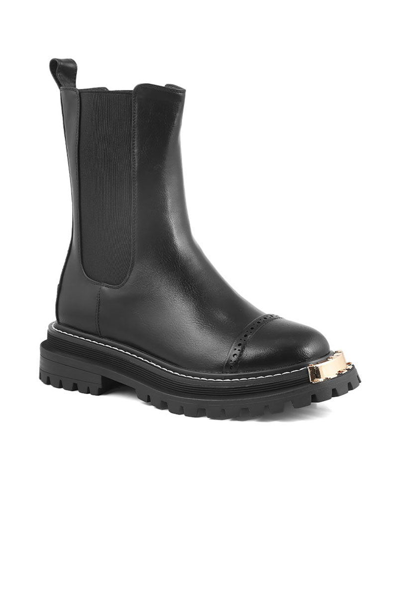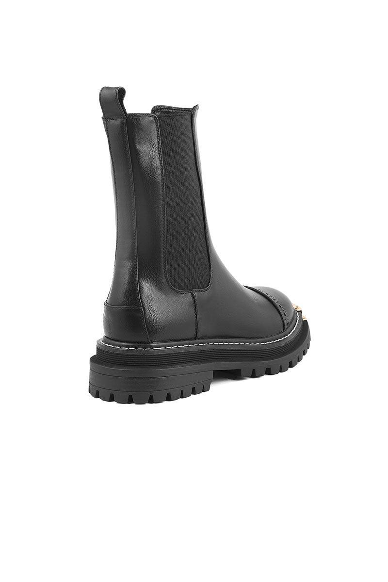 These black chunky ankle boots are made with the lustrous leather, with stretchable side patches, and metallic adornment at front top.