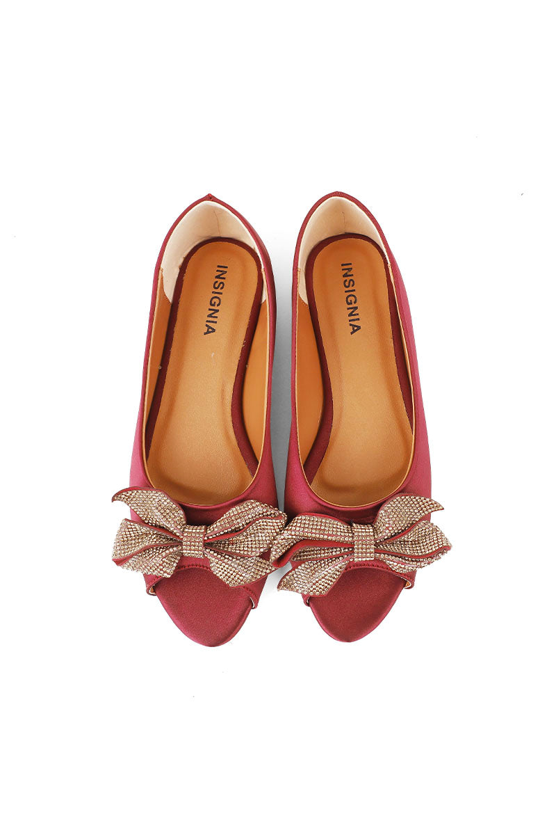 These maroon colored shoes are made with the lustrous satin, adorned with the cute bow at top, shaped to a peeped toe and then set over the small stacked heel.
