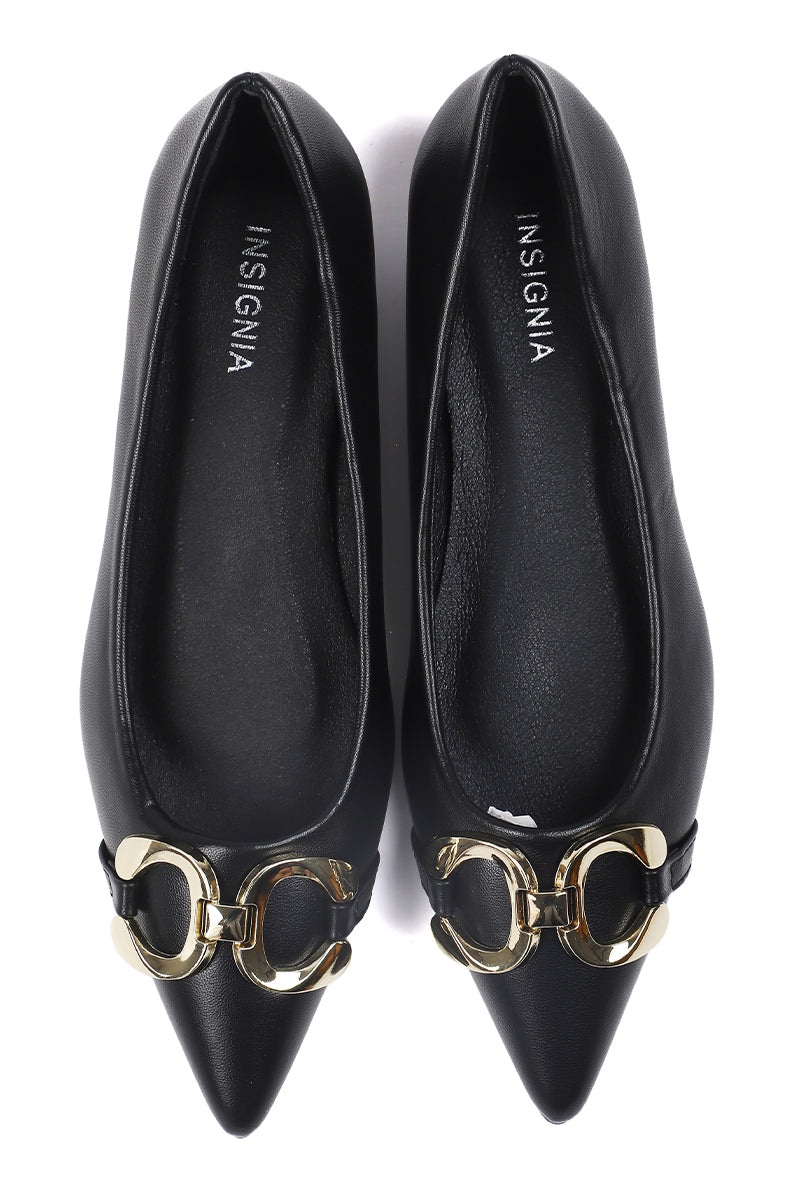 These black pumps are made with the leather, having buckle embellishment at top, and then shaped to a pointed toe.