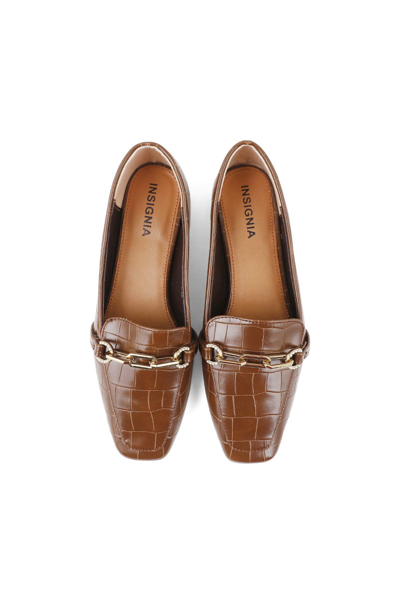 These brown loafers are made with the crocodile-effect leather, adorned with the metallic horse-bit at top and then shaped to the squared toe.
