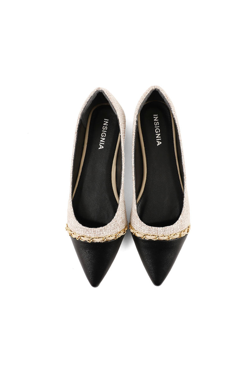 These fawn pumps are made with the grained leather while its sharp pointed toe shape is made with the patent leather and then set over a flatform base.