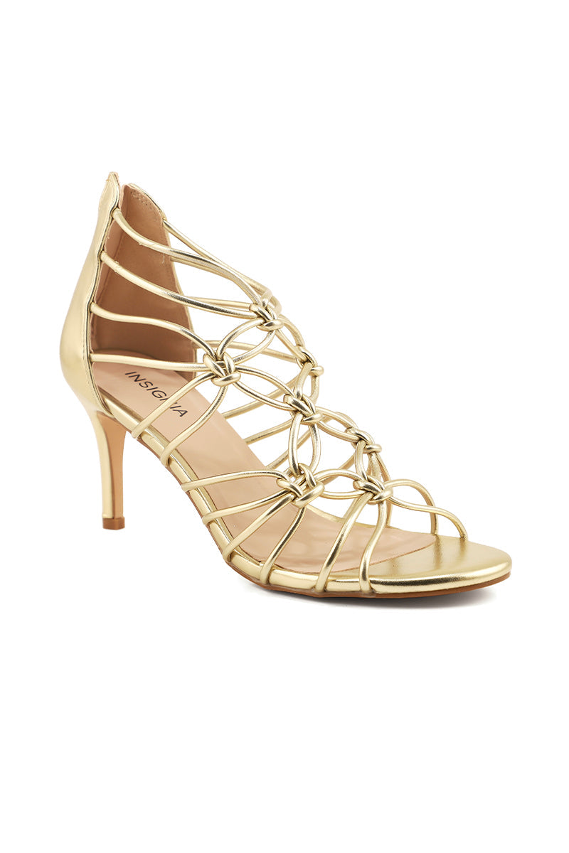 These golden shoes are made with the mesh of multiple slender strap, shaped to an open toe and then set over a reasonable heel height.