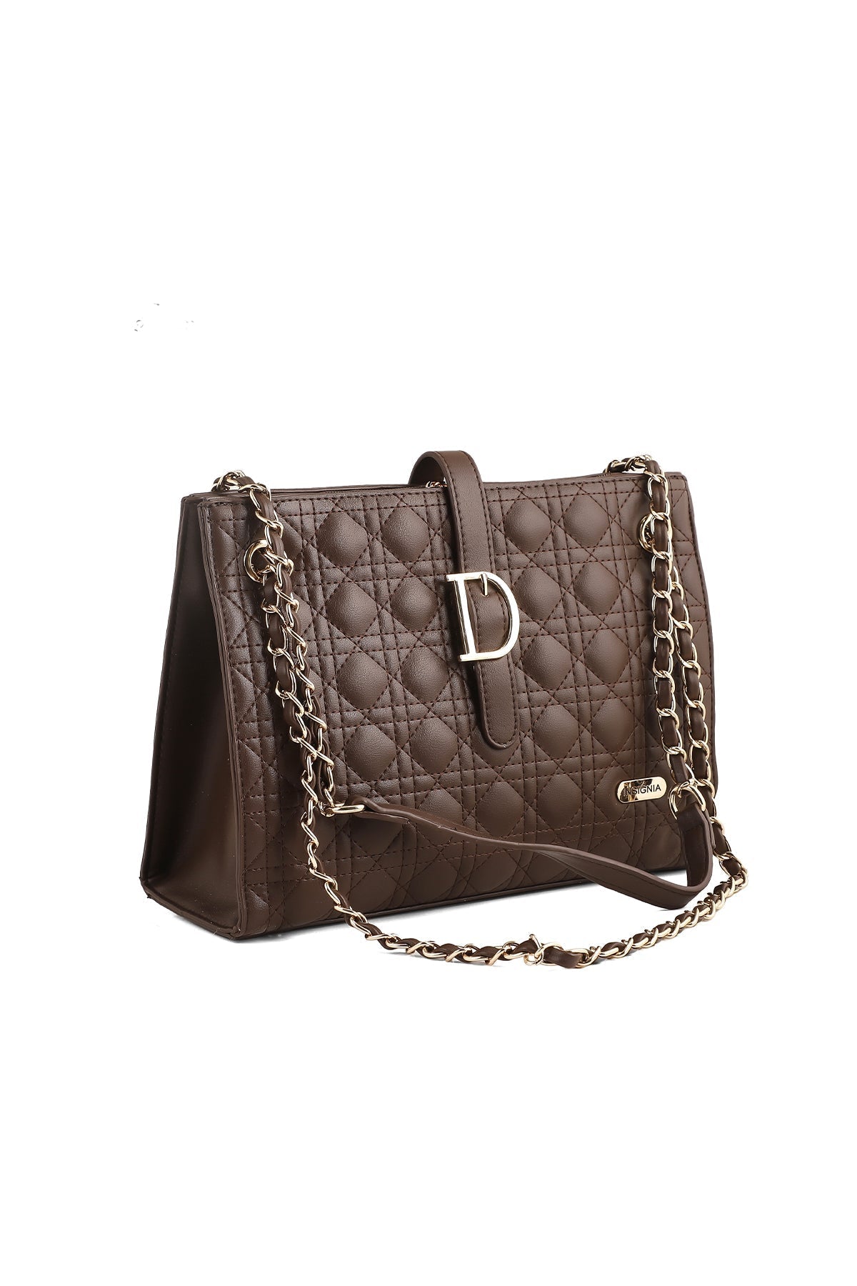 This coffee colored bag is made with the genuine leather, having popping button design, with two chain straps and then finished with a buckle lock.