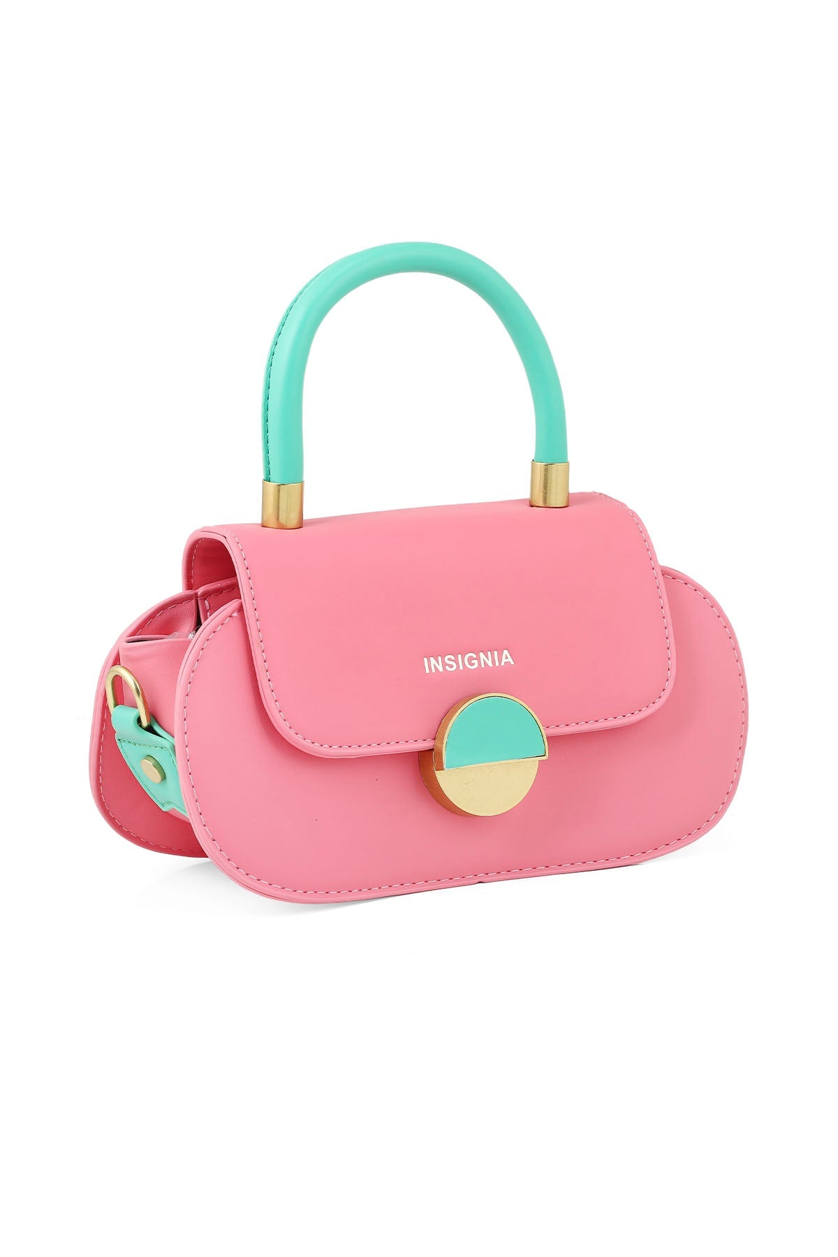 This is a Shocking pink crossbody bag with a woven design, gold hardware, and a tassel charm.