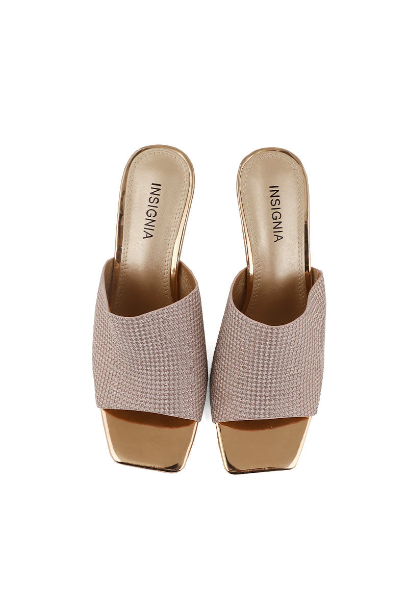 These peach slides are beautifully crafted with a wide arch strap that itself shines like stars over the sky and then set with kitten heel.
