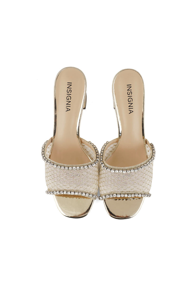 These golden slides are gorgeously crafted with shimmery net arch strap having double sided borders with open toe and then set over a chunky block heel.