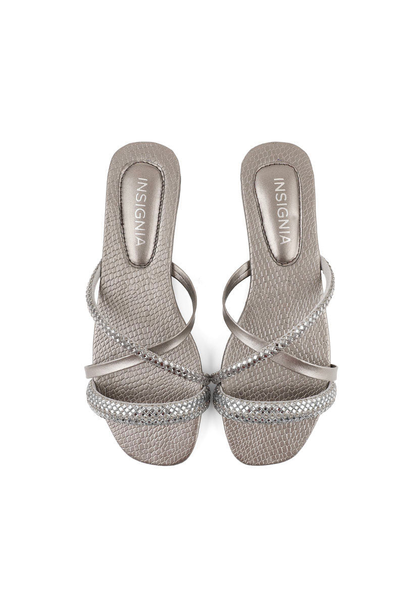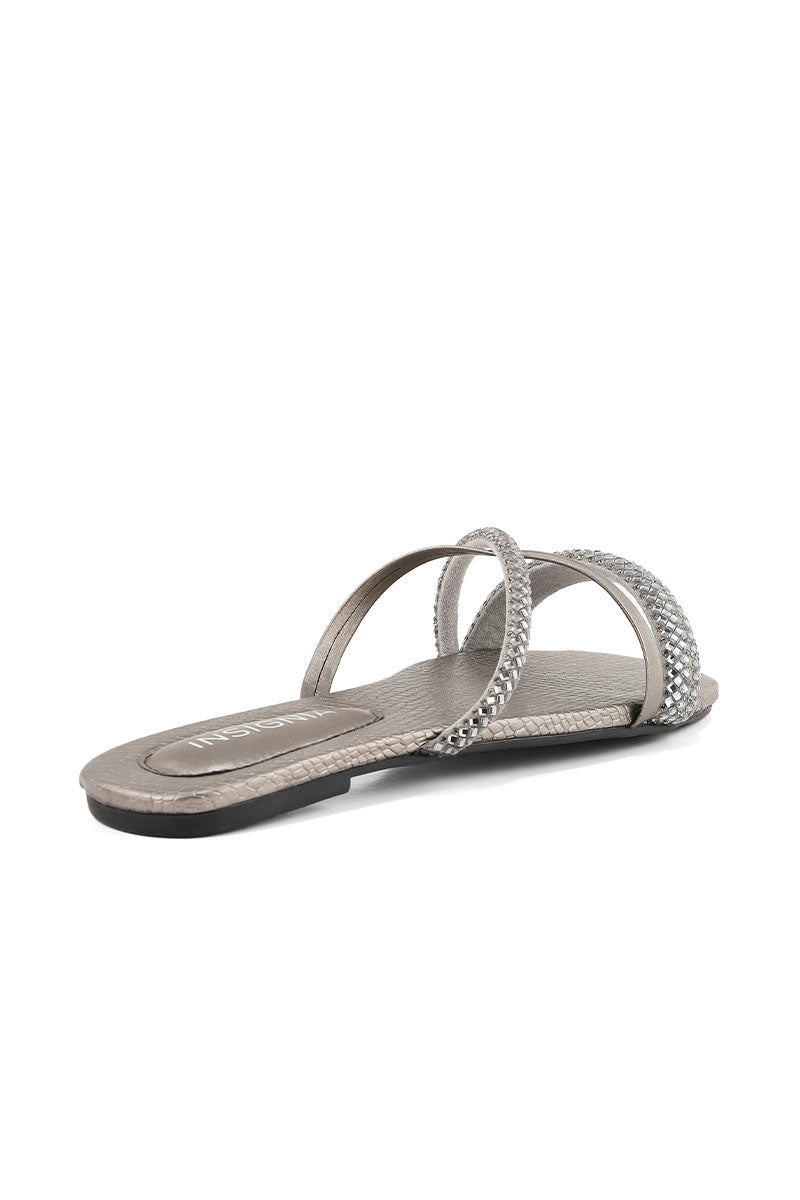 These grey slides are made with the lustrous sole, having multiple slender straps that is shaped to an open toe over a flatform base.