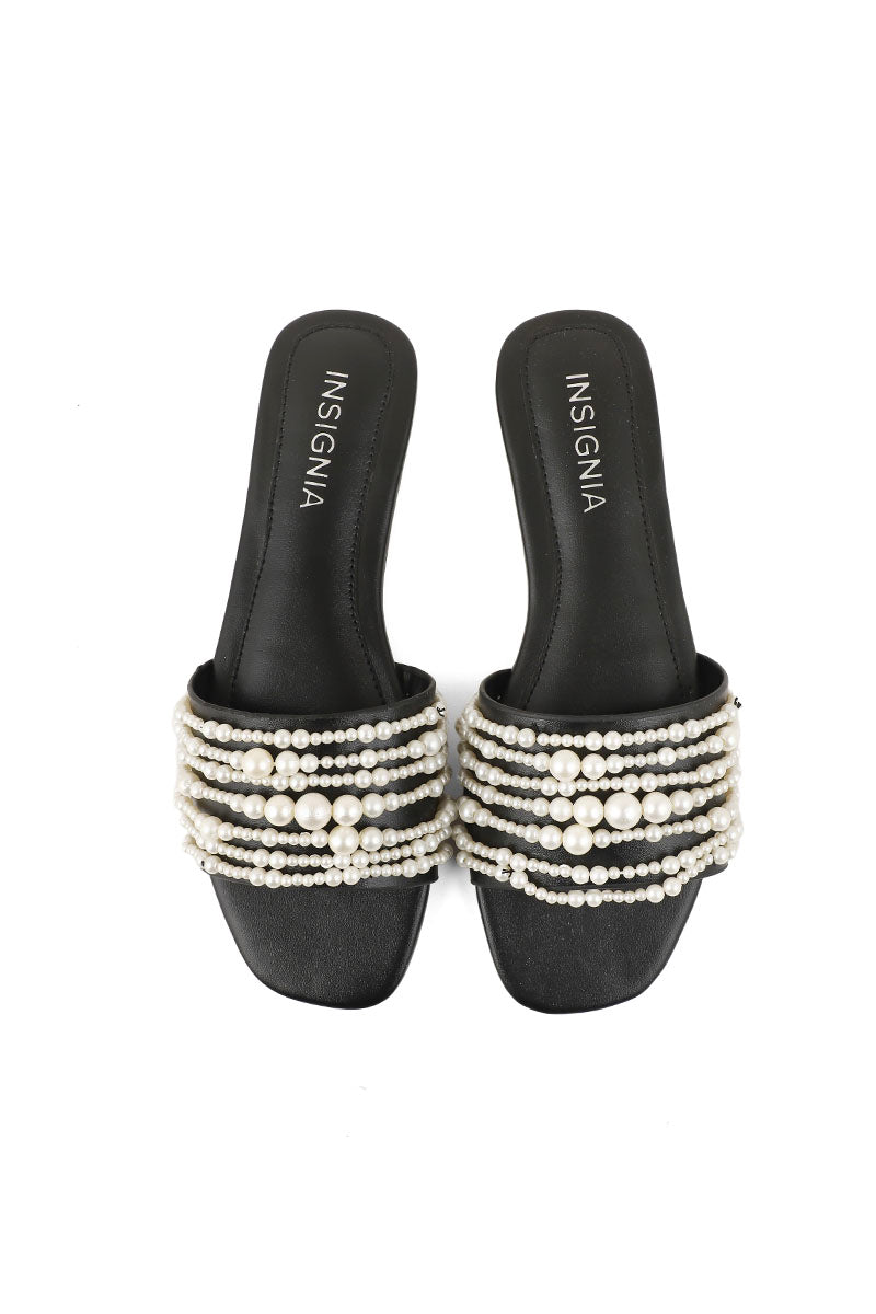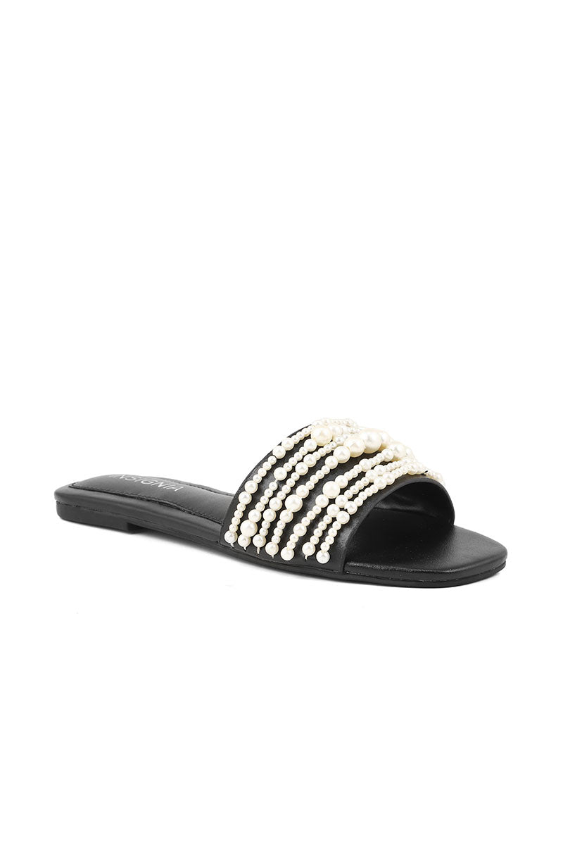These black slides are made with the quality leather, having one wide arch strap and shaped to an open toe.