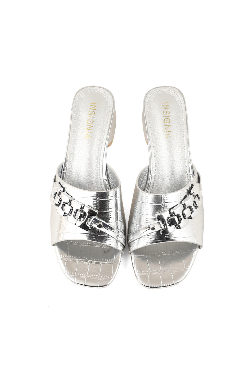 These silver slides are made with the lustrous leather, having a wide arch strap that is adorned with the fancy chain and then set over the block heel.