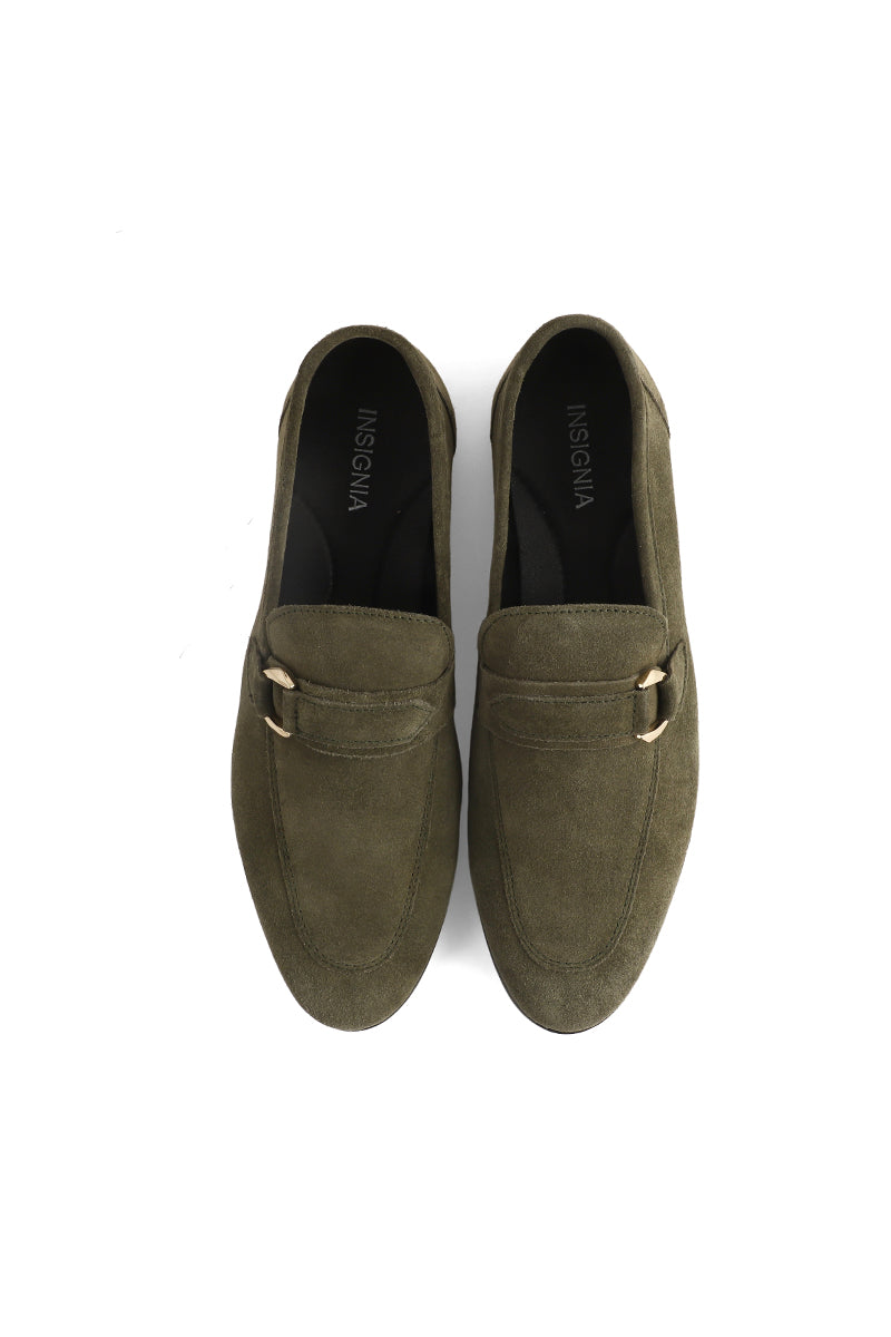 These green moccs are made with the fine suede, having an almond toe shape with embellishment of buckle strap at top, then set over a small stacked heel.